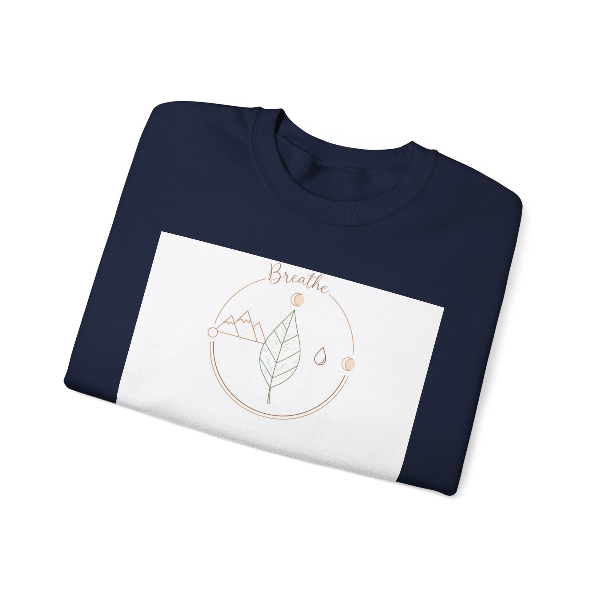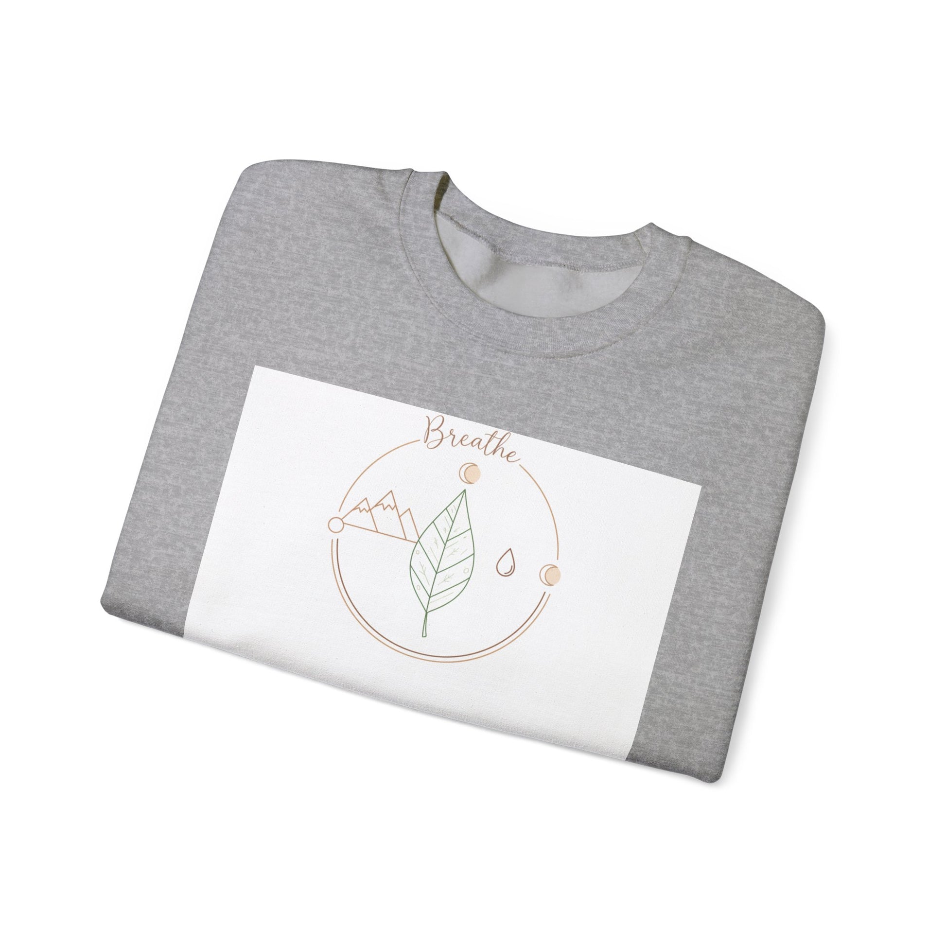 A tranquil, nature-focused crewneck featuring a minimal line-leaf framed by a soft circular motif and tiny celestial accents. The design uses spare, meditative symbols—leaf, moon, and stars—to convey grounding and breathwork without words, aligning with nature-symbol coping and subtle mindfulness aesthetics. Rendered in muted, earthy tones on a clean sweatshirt canvas, it reads calm and timeless for outdoor-minded, wellness-focused wardrobes.